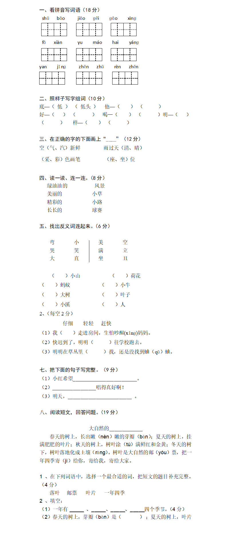 **一年级语文下册期中试卷及答案,word格式,共2页,可打印下载**