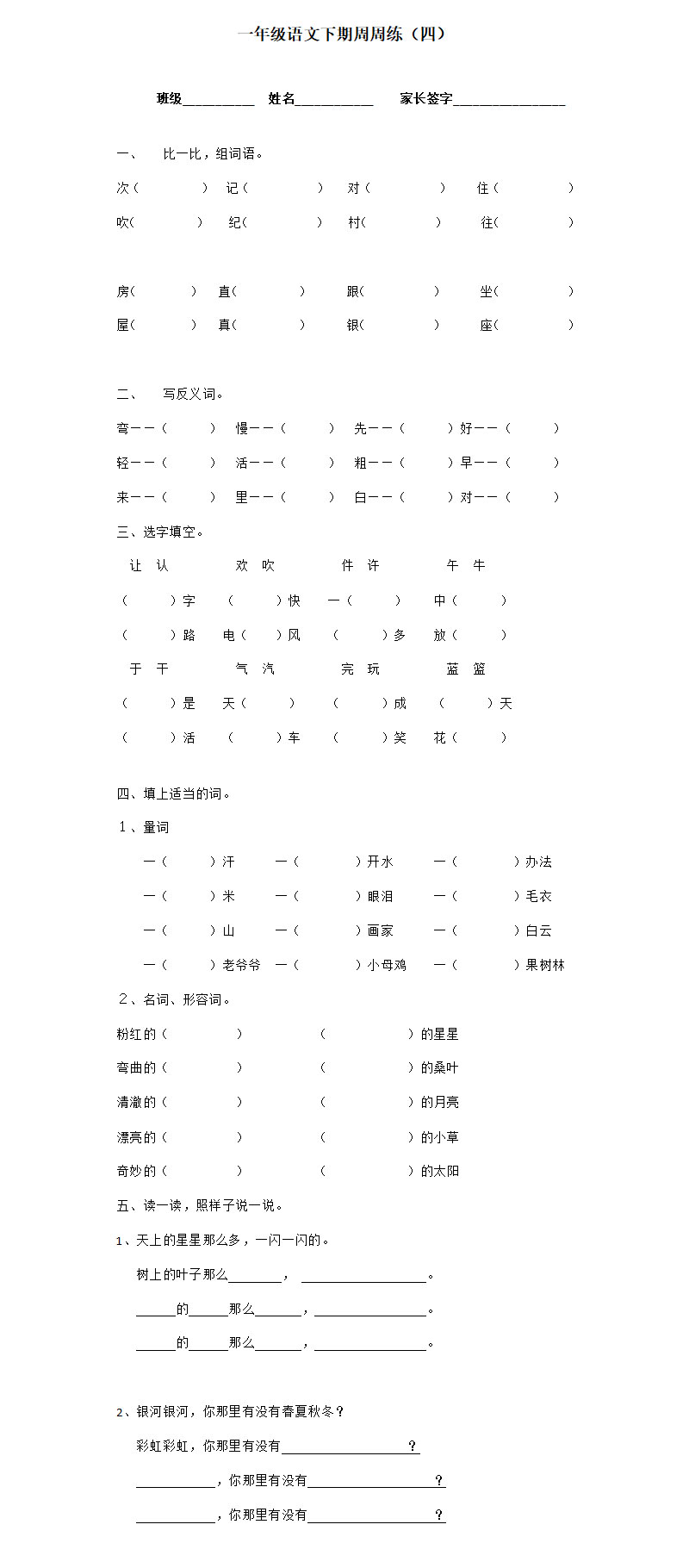 **一年级语文下册周练练4,word格式,共3页,可打印下载**