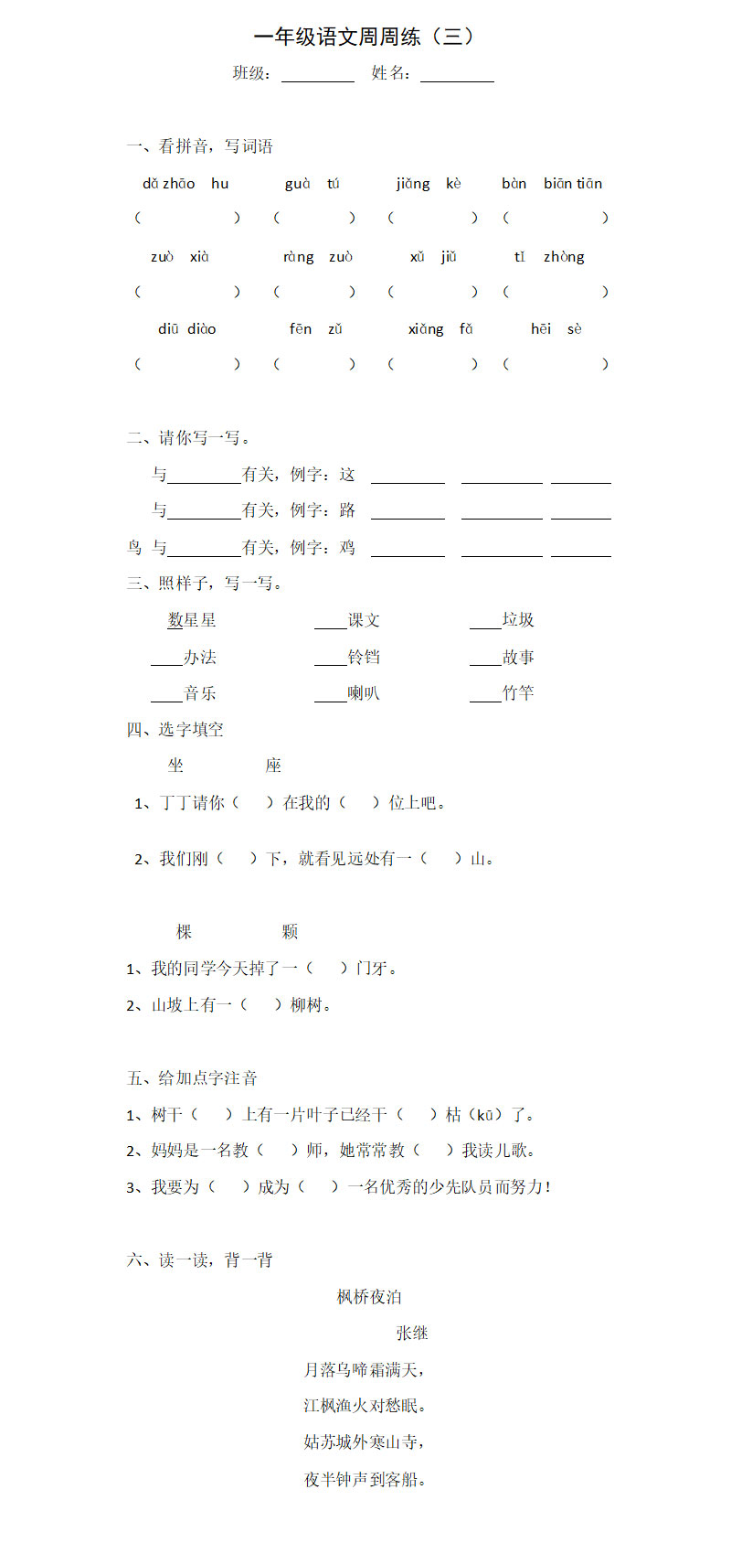 **一年级语文下册周周练3,word格式,共2页,可打印下载**