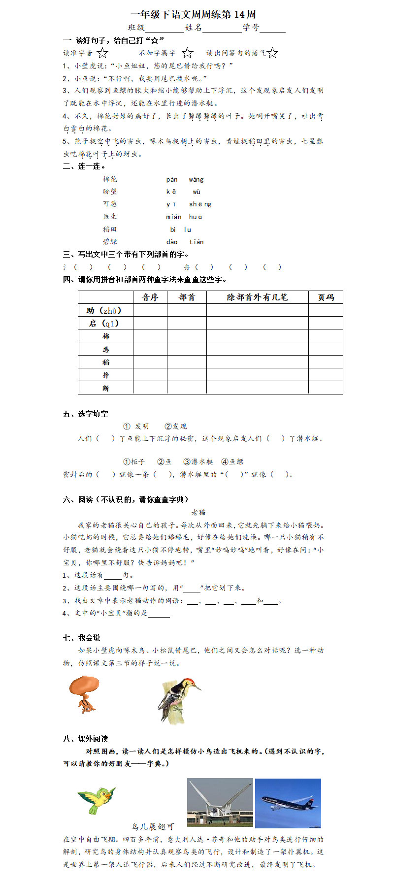 **一年级语文下册周周练第十四周,word格式,共3页,可打印下载**