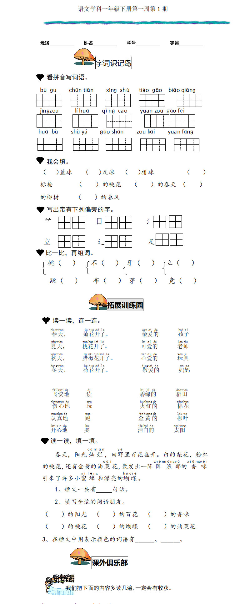 **一年级语文下册第一周练习题,word格式,共1页,可打印下载**