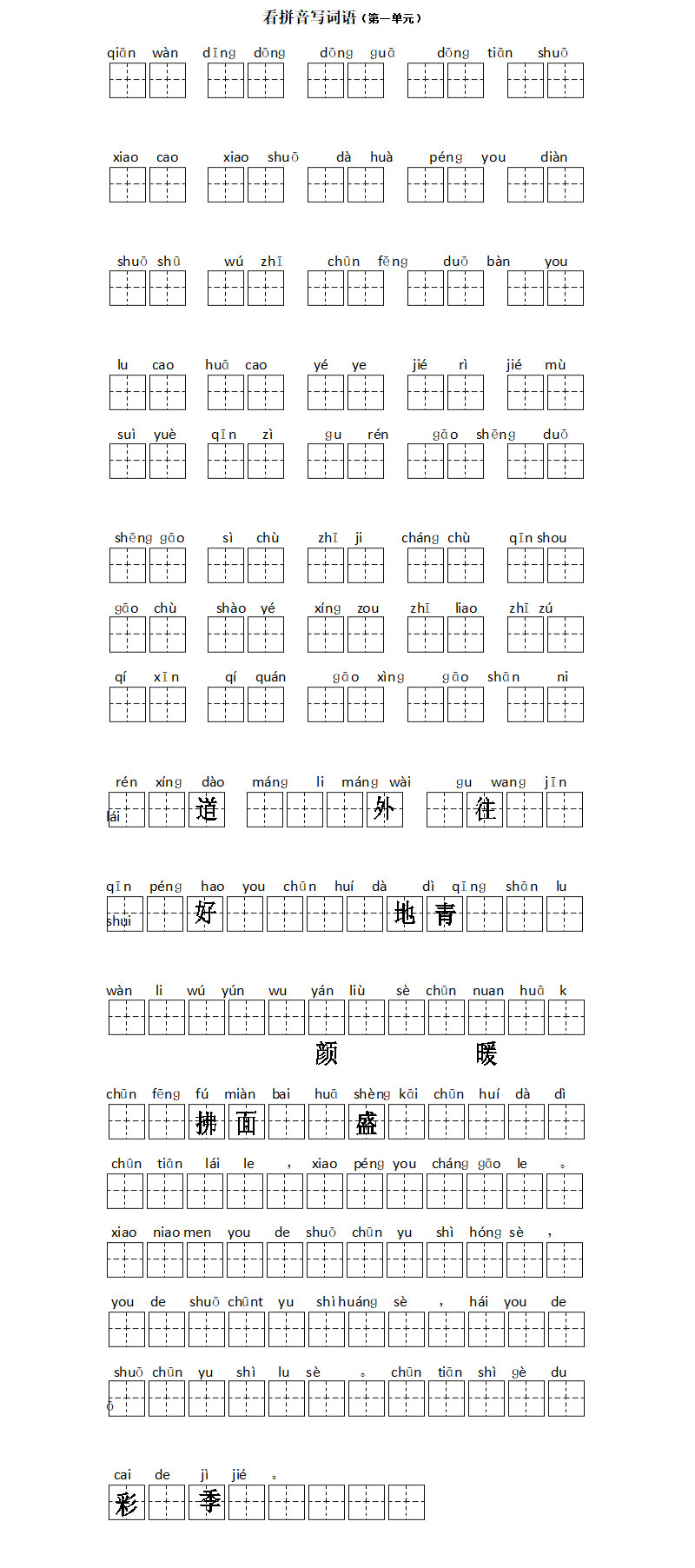 **一年级语文下册第一单元看拼音写词语练习题,word格式,共2页,可打印下载**