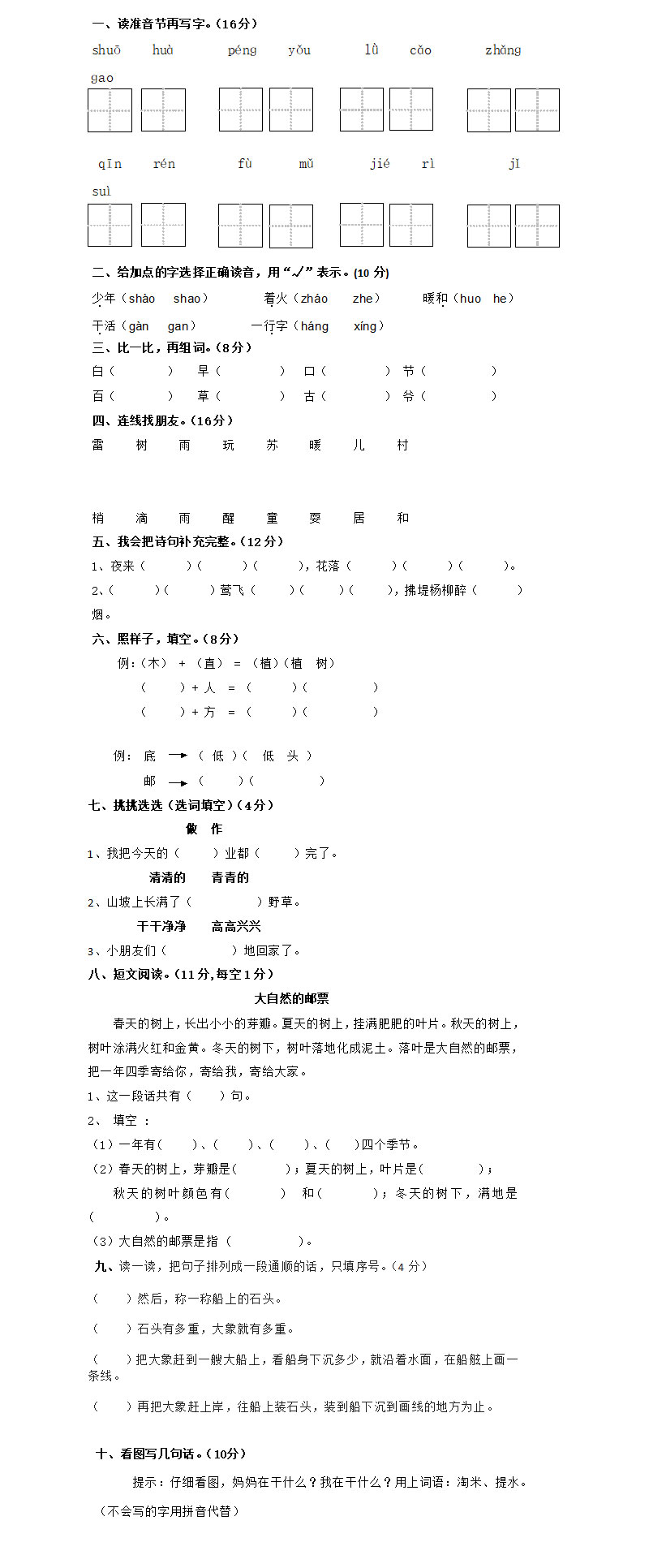 **一年级语文下册第一次月考试卷,word格式,共2页,可打印下载**
