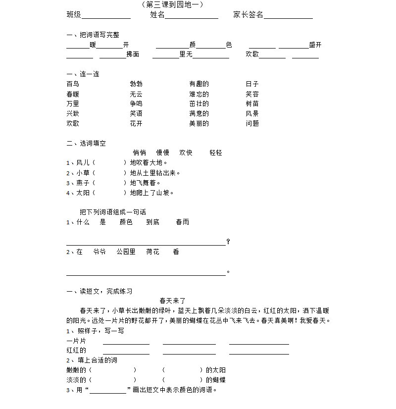 **一年级语文下册第三课到语文园地一练习题,word格式,共1页,可打印下载**
