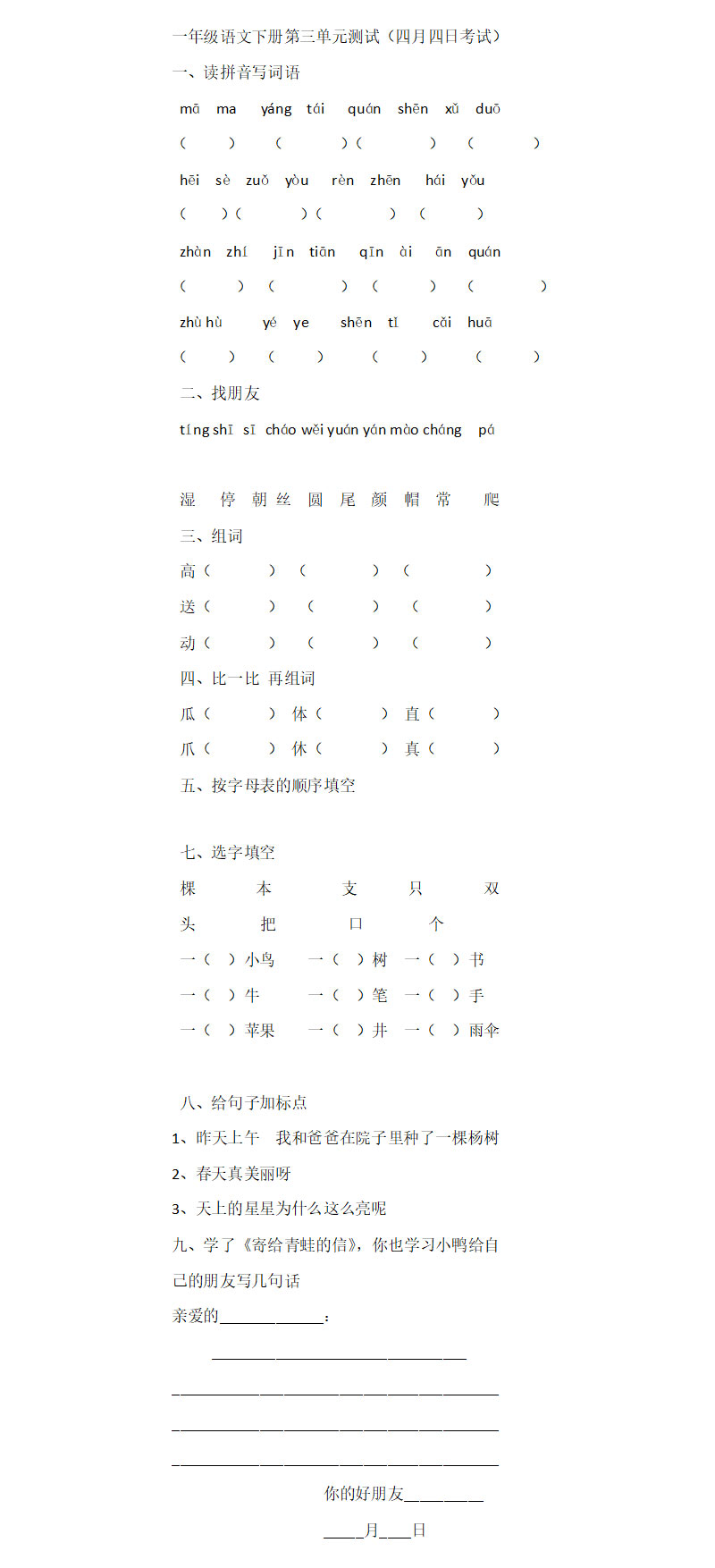 **一年级语文下册第三单元测试,word格式,共1页,可打印下载**