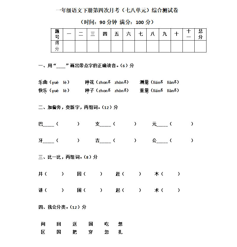 一年级语文下册第七八单元测试题