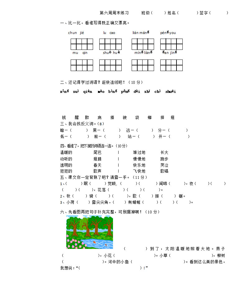 **一年级语文下册第六周周末练习,word格式,共1页,可打印下载**