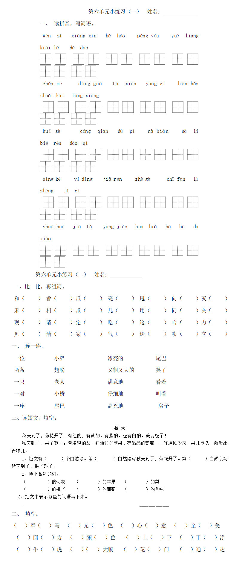 **一年级语文下册第六单元练习题,word格式,共2页,可打印下载**