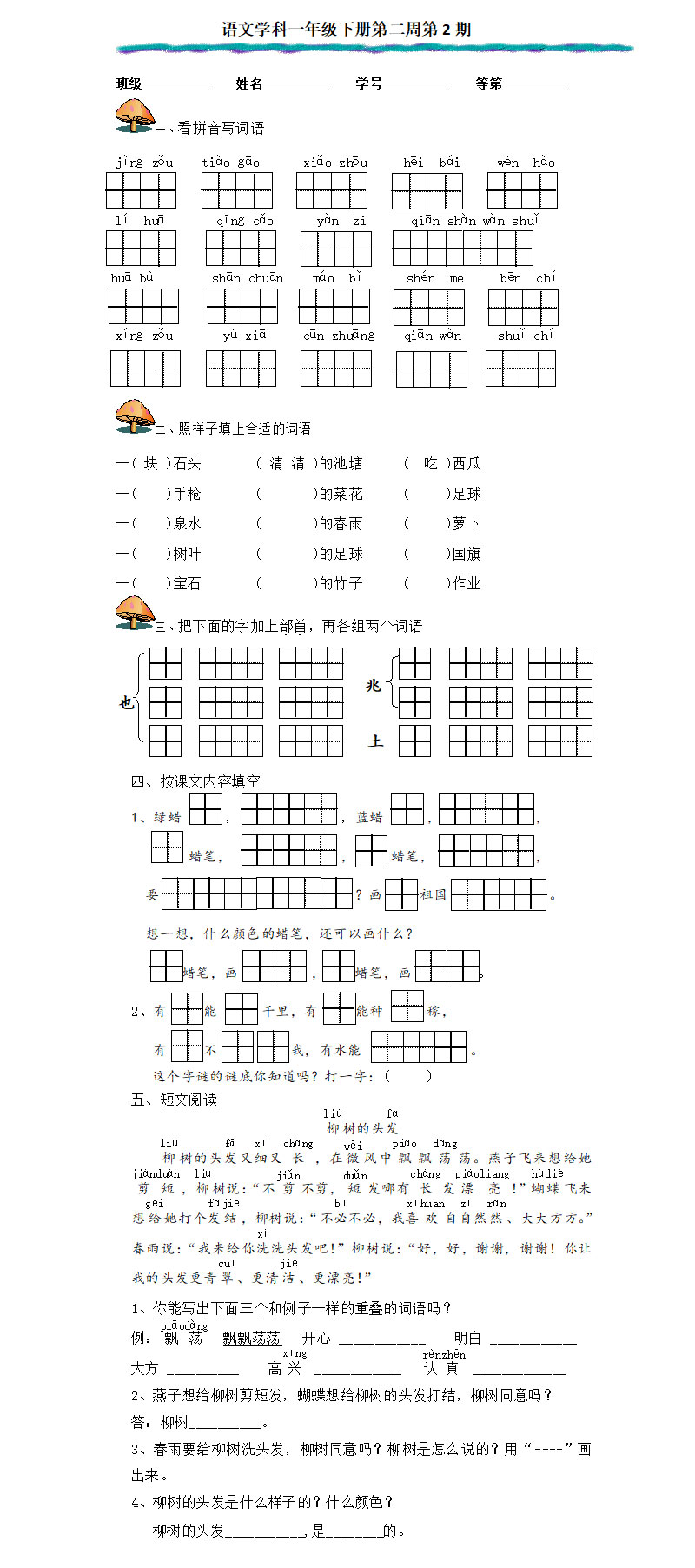 **一年级语文下册第二周练习题,word格式,共3页,可打印下载**