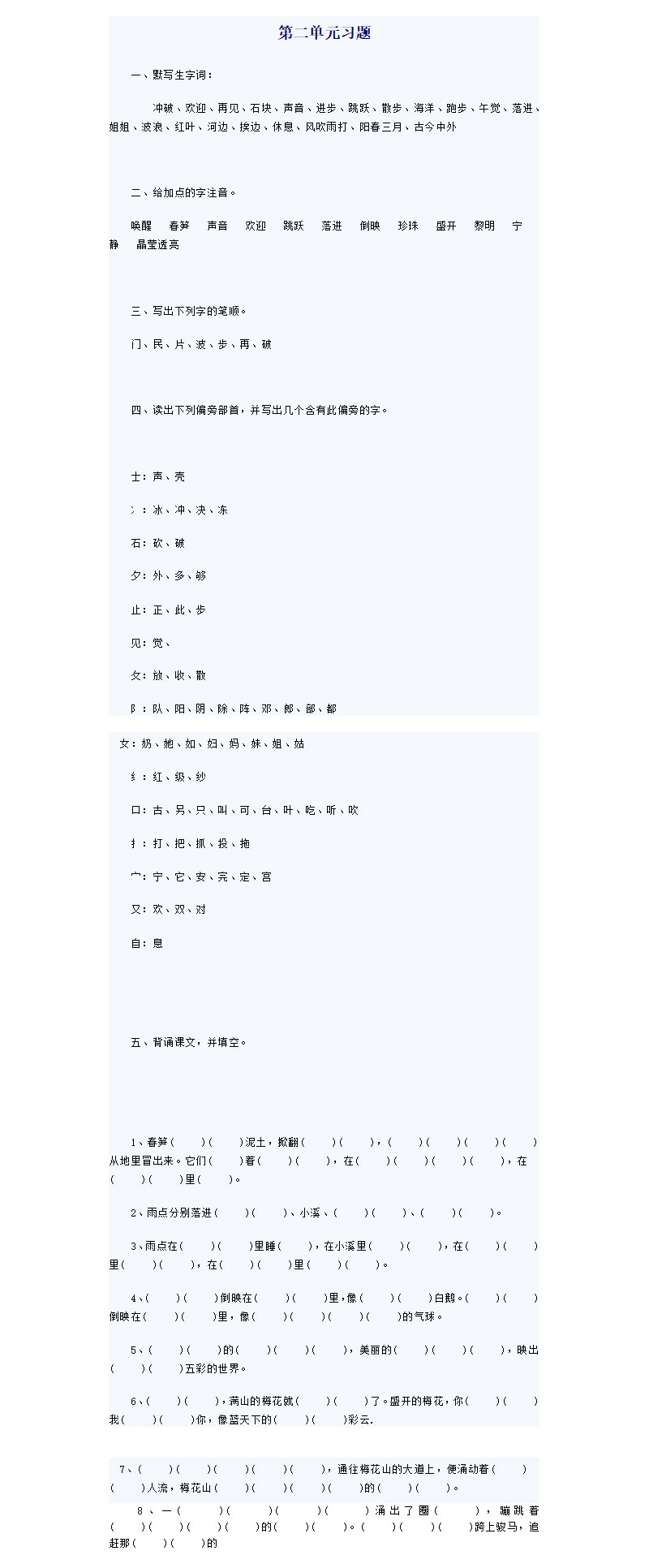 **一年级语文下册第二单元复习题,word格式,共3页,可打印下载**