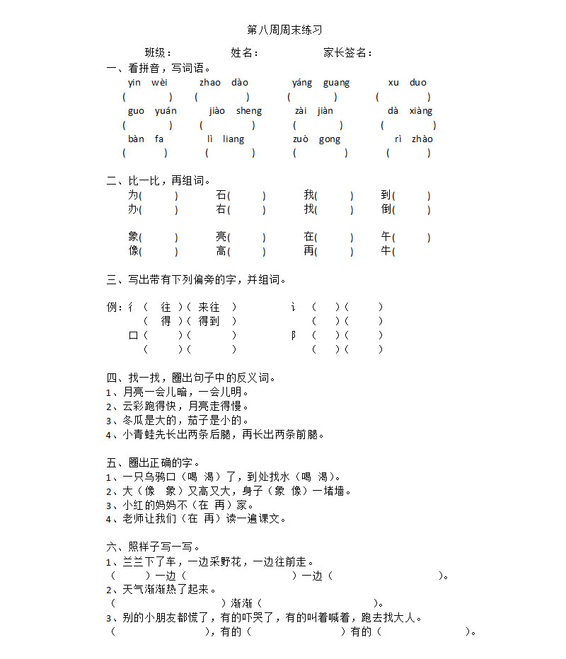 **一年级语文下册第8周周末练习,word格式,共1页,可打印下载**