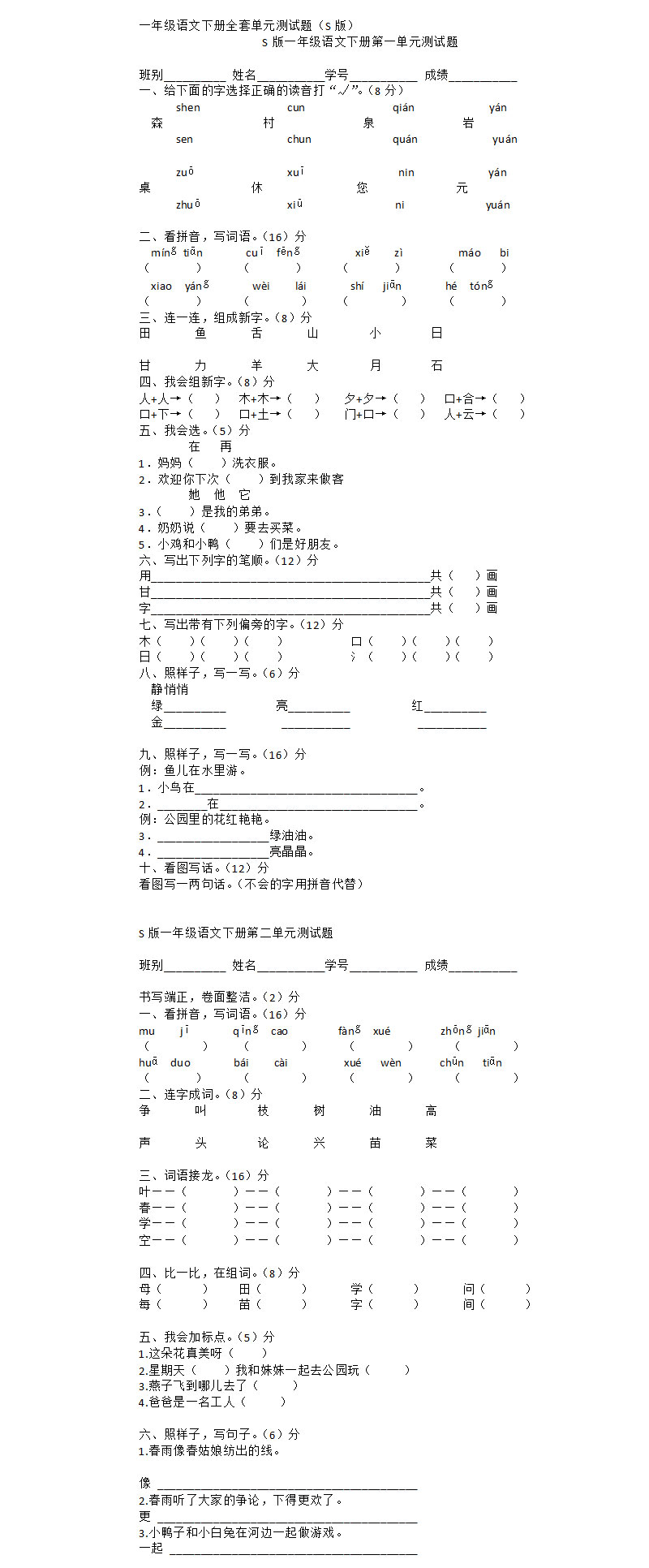 **一年级语文下册单元练习题全册,word格式,共10页,可打印下载**