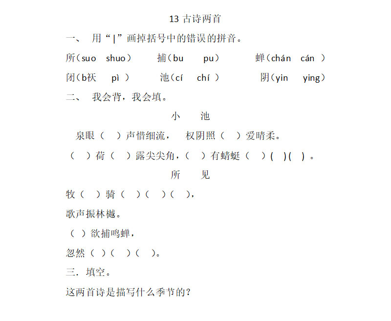 **一年级语文下册13古诗两首练习题,word格式,共1页,可打印下载**