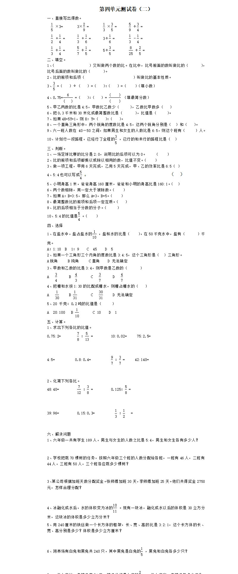 **2021年青岛版六年级数学上册第四单元测试题及答案二,word格式,共4页,可打印下载**