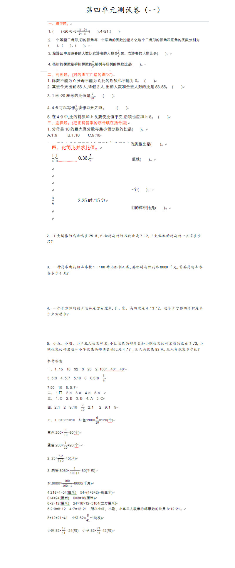 **2021年青岛版六年级数学上册第四单元测试题及答案一,word格式,共3页,可打印下载**