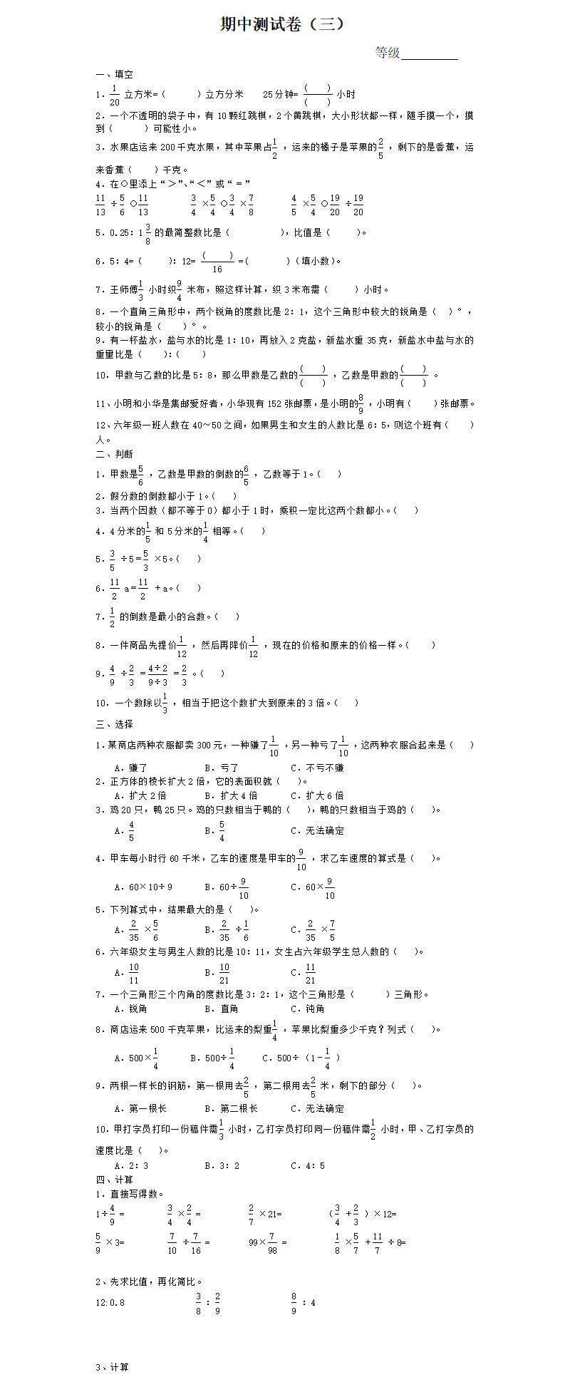 **2021年青岛版六年级数学上册期中测试题及答案三,word格式,共5页,可打印下载**
