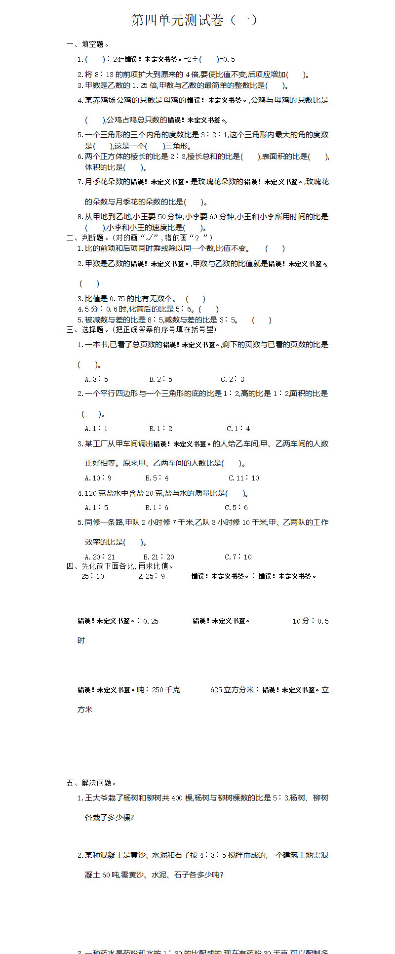 **2021年人教版六年级数学上册第四单元测试题及答案一,word格式,共5页,可打印下载**