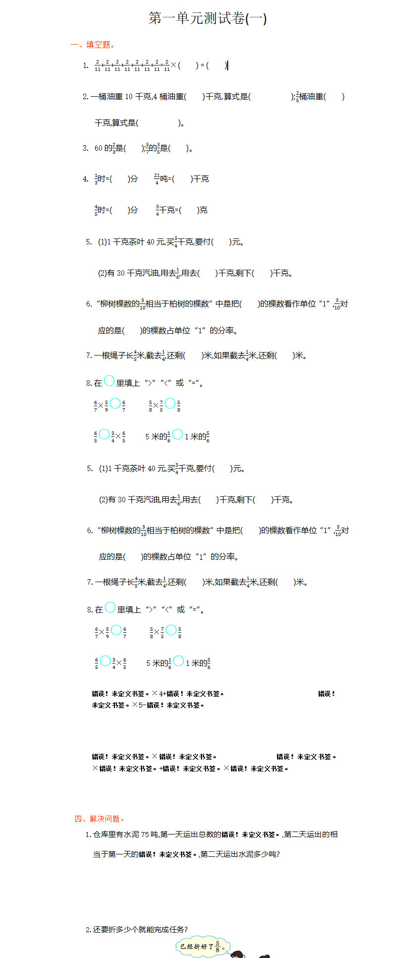 **2021年人教版六年级数学上册第一单元测试题及答案(二),word格式,共5页,可打印下载**