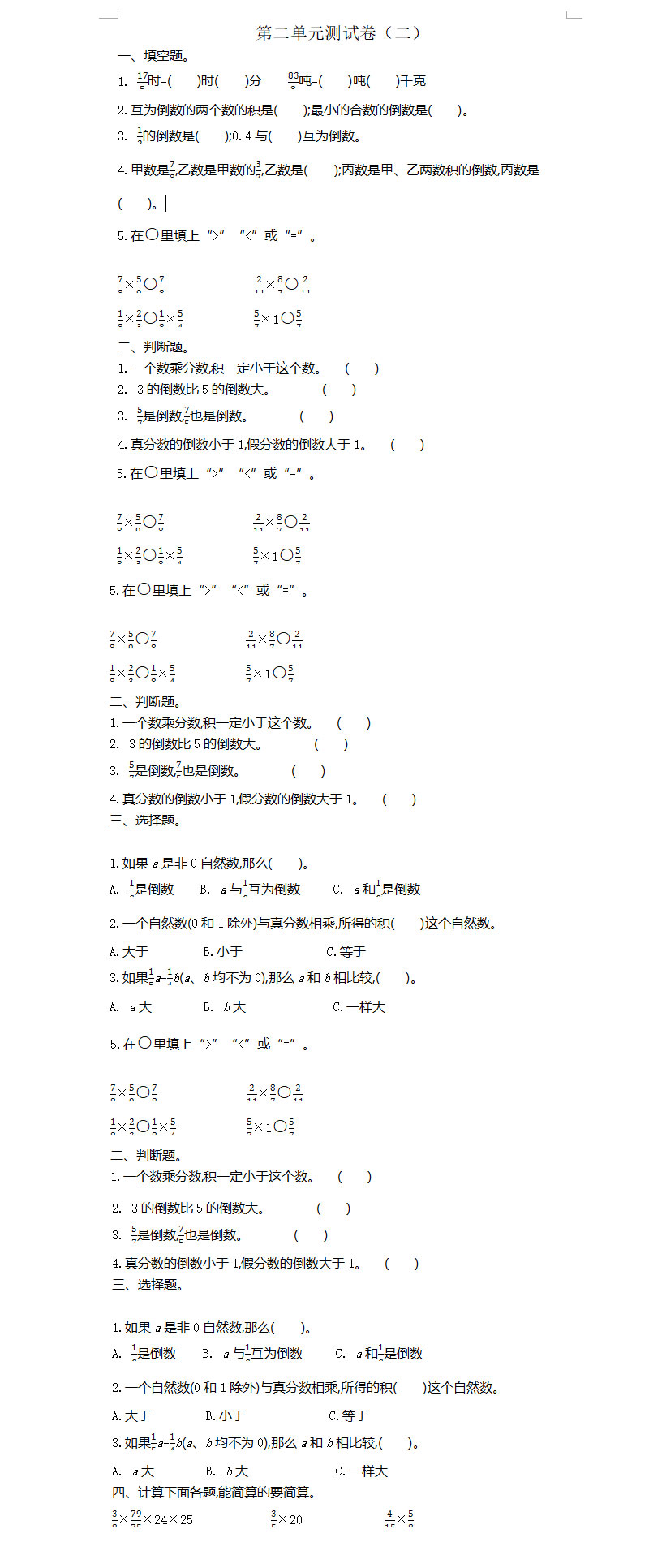 **2021年苏教版六年级数学上册第二单元测试题及答案二,word格式,共3页,可打印下载**