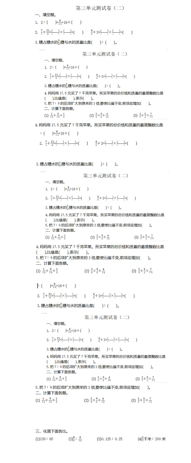 **2021年苏教版六年级数学上册第三单元测试题及答案二,word格式,共4页,可打印下载**