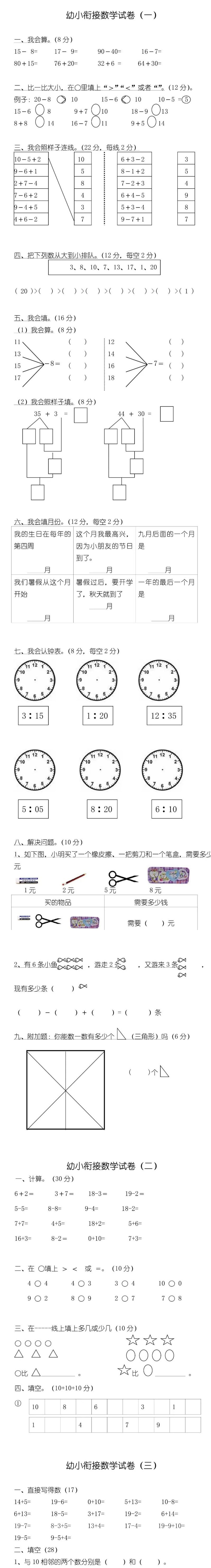 **幼小衔接数学试卷三十七套,pdf格式,共81页,可打印下载**