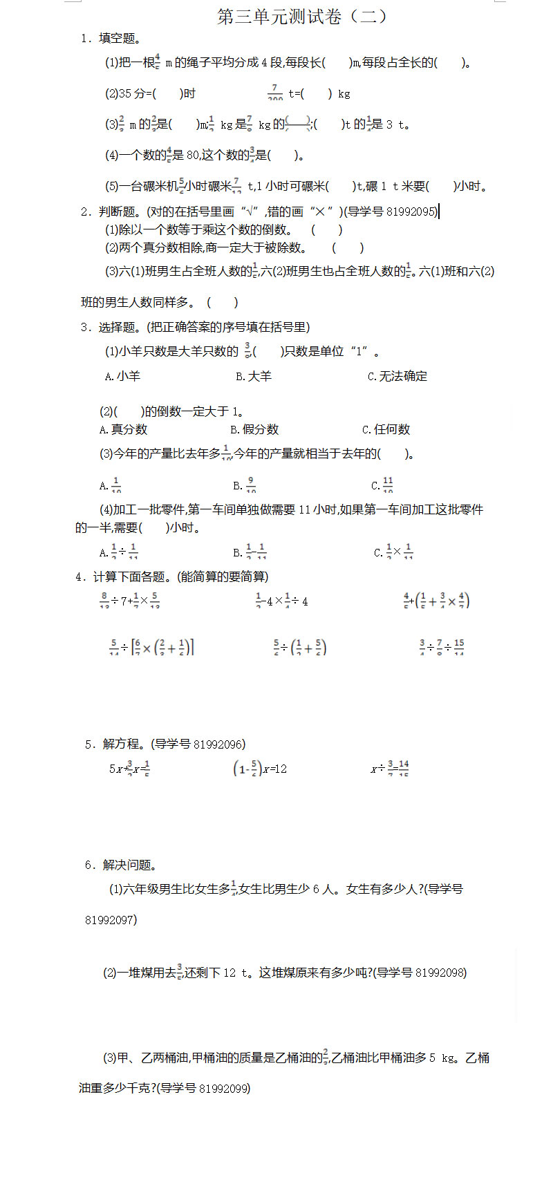 2021年人教版六年级数学上册第三单元测试题及答案二