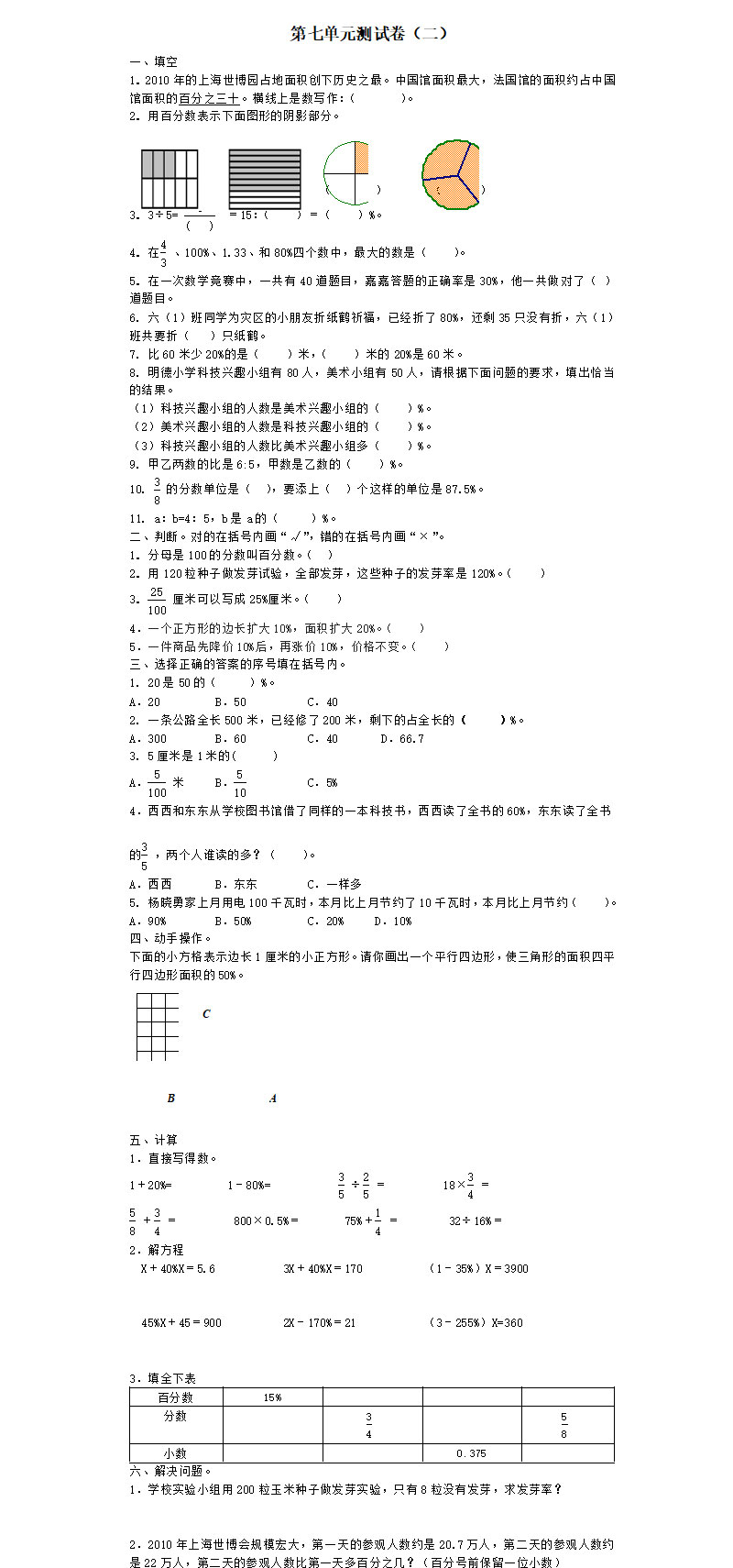 **2021年青岛版六年级数学上册第七单元测试题及答案二,word格式,共4页,可打印下载**