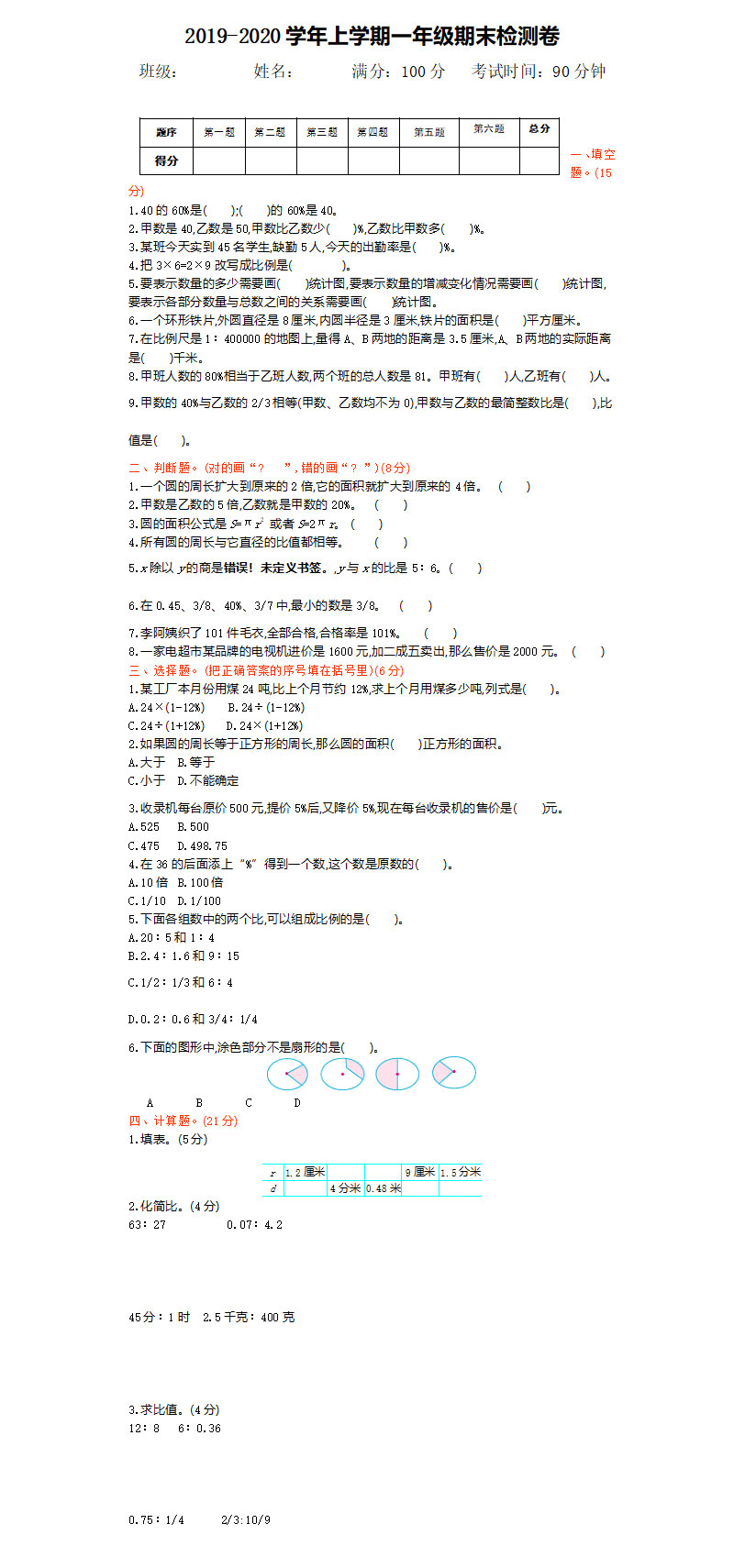 **2021年冀教版六年级数学上册期末测试题及答案,word格式,共3页,可打印下载**