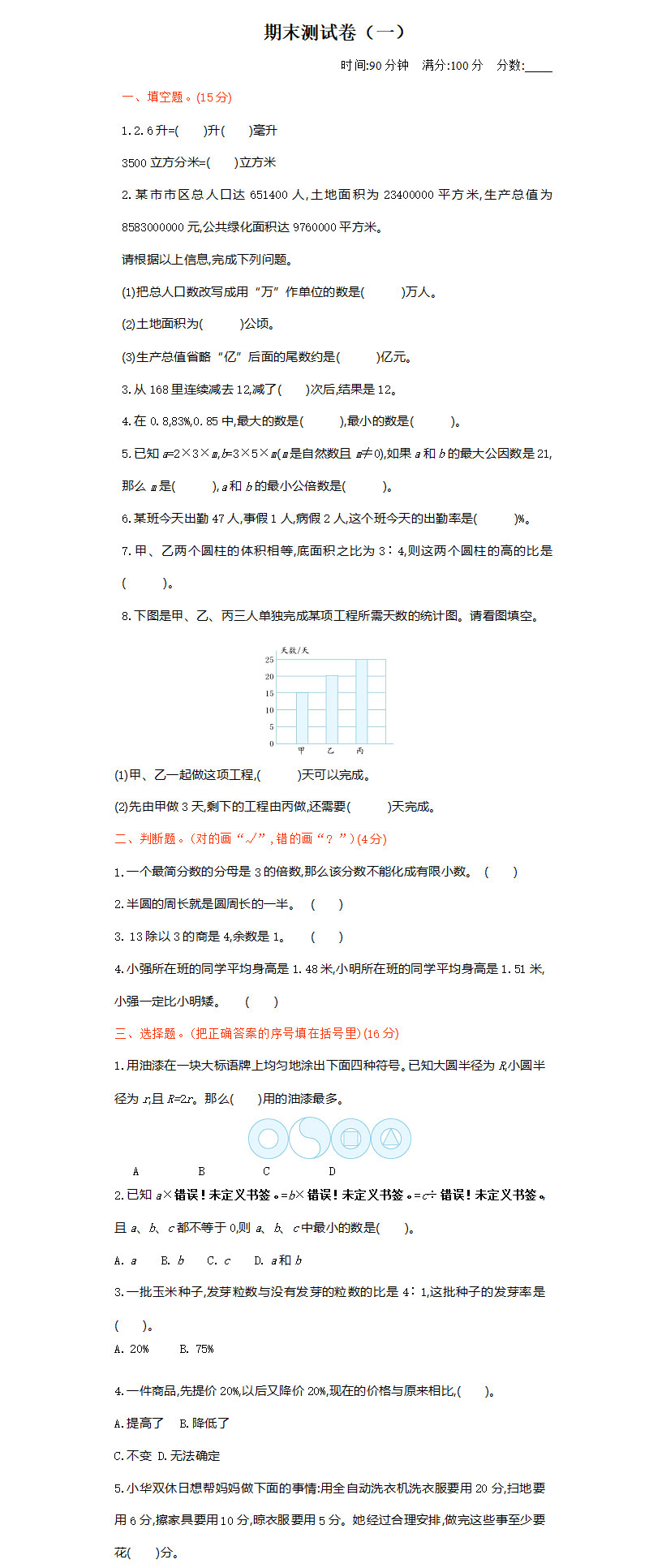 **2021年北师大版六年级数学下册期末测试题及答案一,共7页,可打印下载**