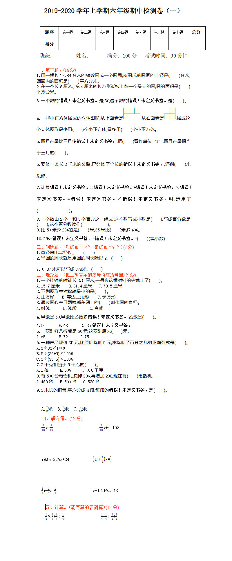**2021年北师大版六年级数学上册期中测试题及答案一,共3页,可打印下载**