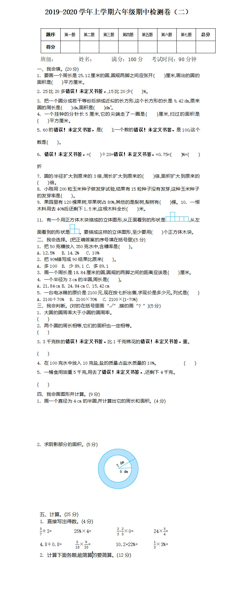 2021年北师大版六年级数学上册期中测试题及答案二