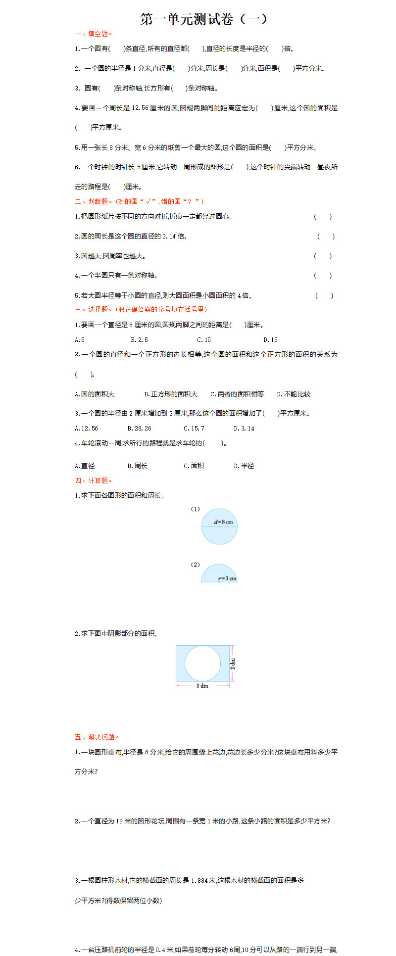 **2021年北师大版六年级数学上册第一单元测试题及答案A,共4页,可打印下载**