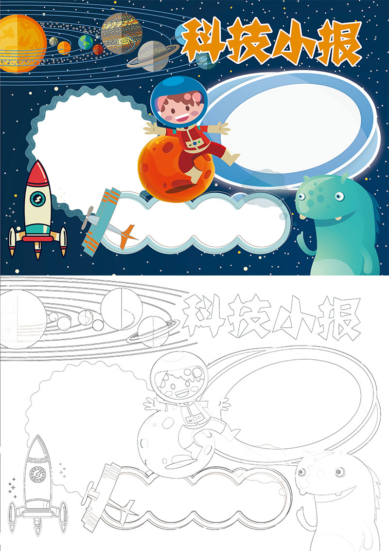 **蓝色太空卡通科技科学小报Word模板,格式为word,节日手抄报风格,可用于手抄报/小报演讲展示,文字图片可以直接替换,使用简单方便。**