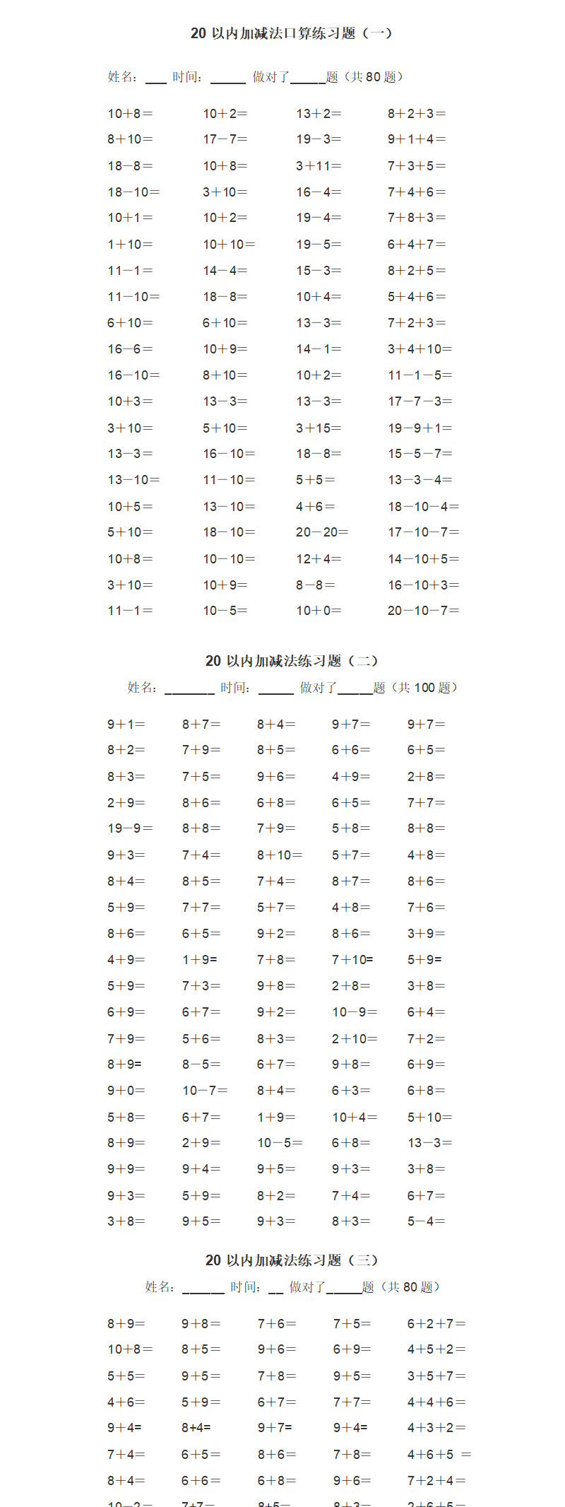 **20以内的加减法练习题(A4可直接免费打印),word格式,共27页,可打印下载**