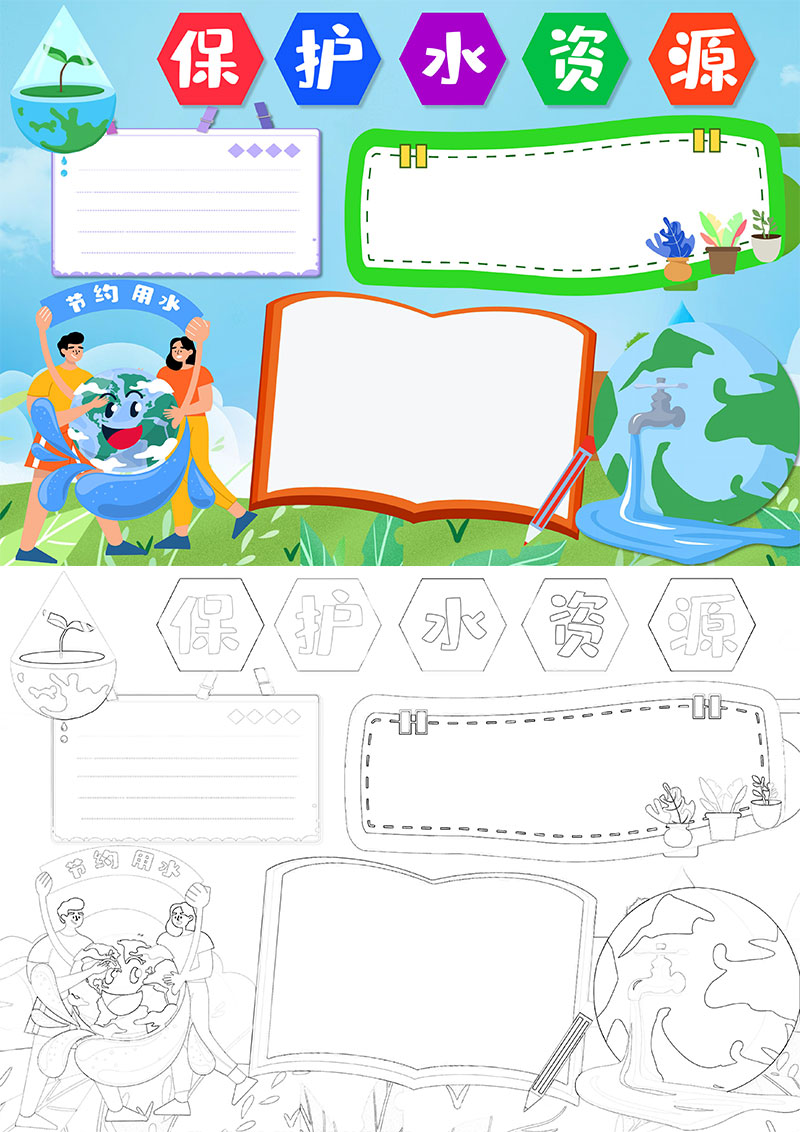 蓝色卡通风格节约用水手抄报电子小报word模版
