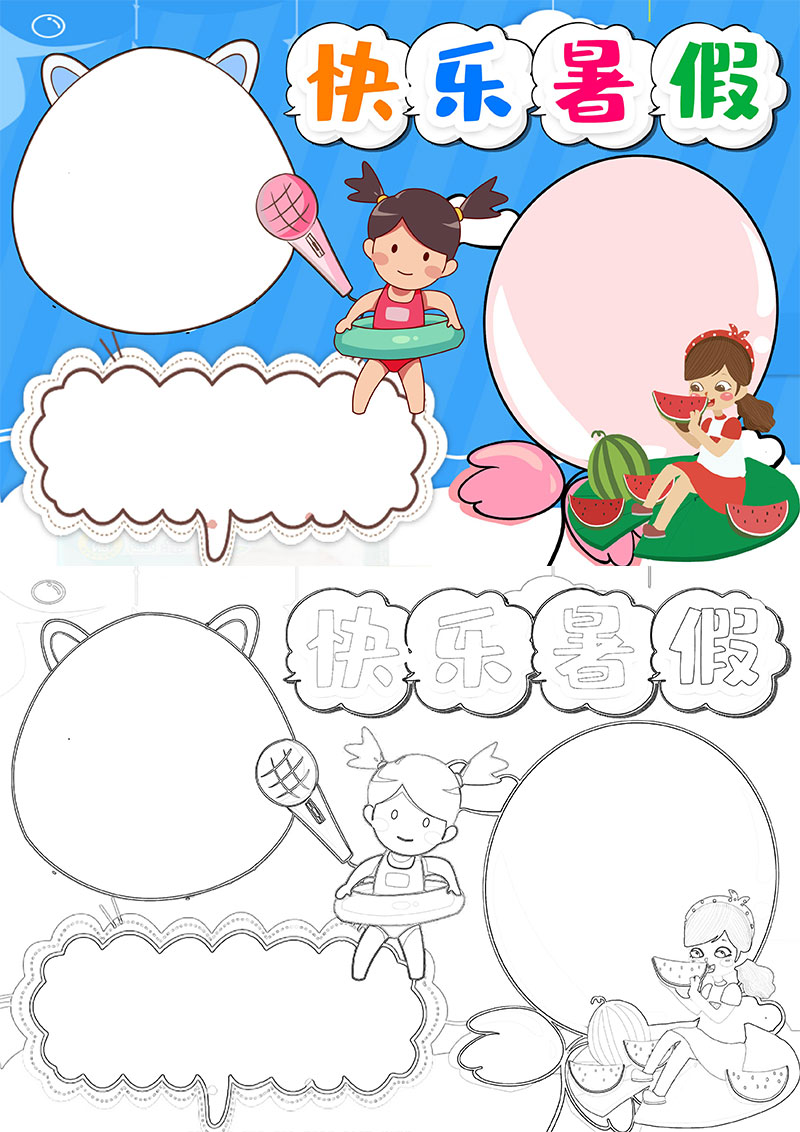 蓝色清凉快乐暑假生活小报手抄报word模板