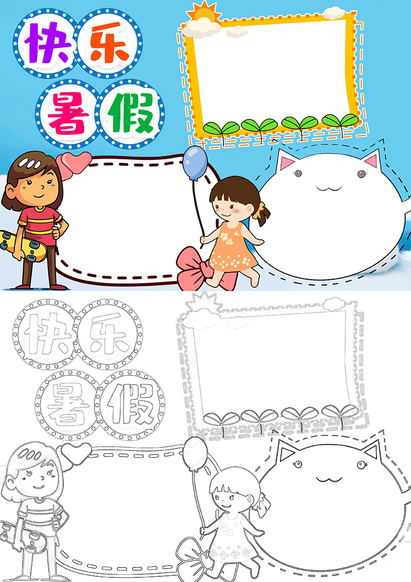 蓝色卡通快乐暑假生活小报手抄报word模板