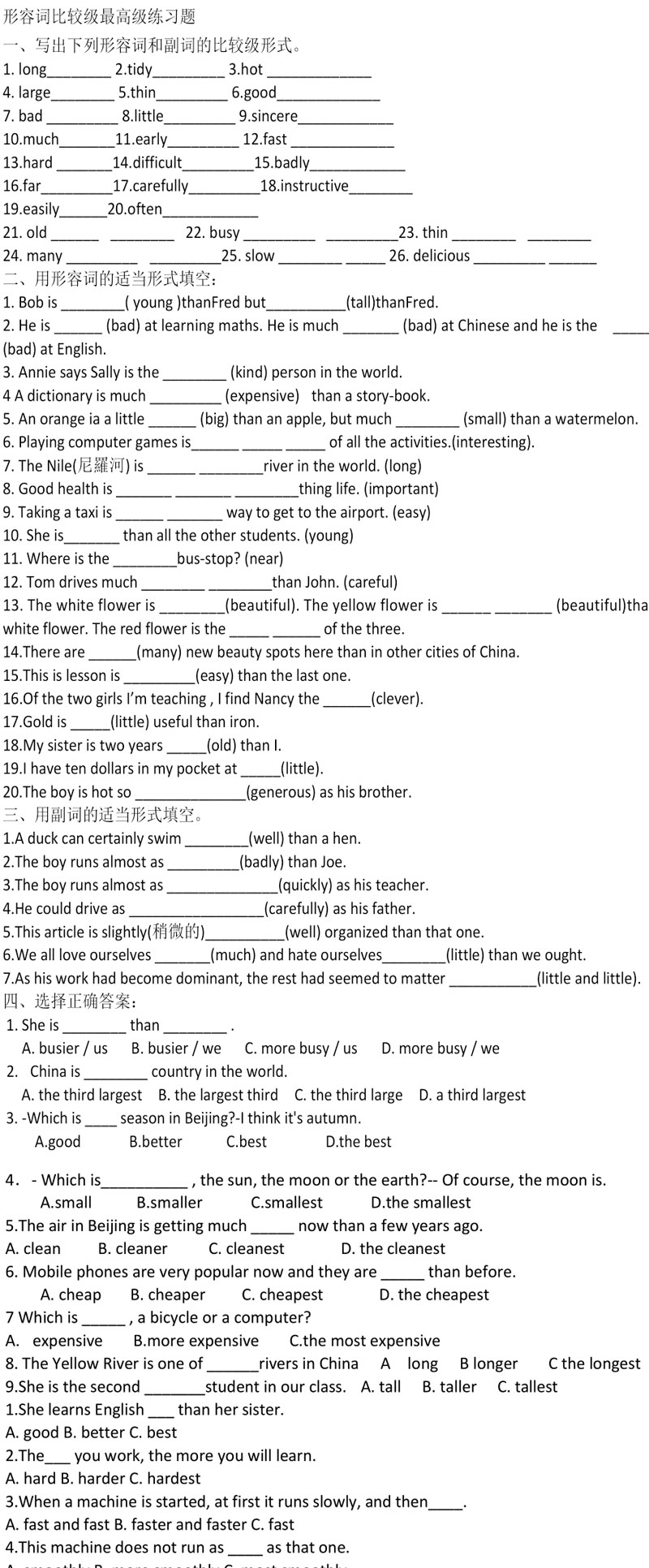 **比较级最高级练习题,格式为pdf,共12页。可打印下载**