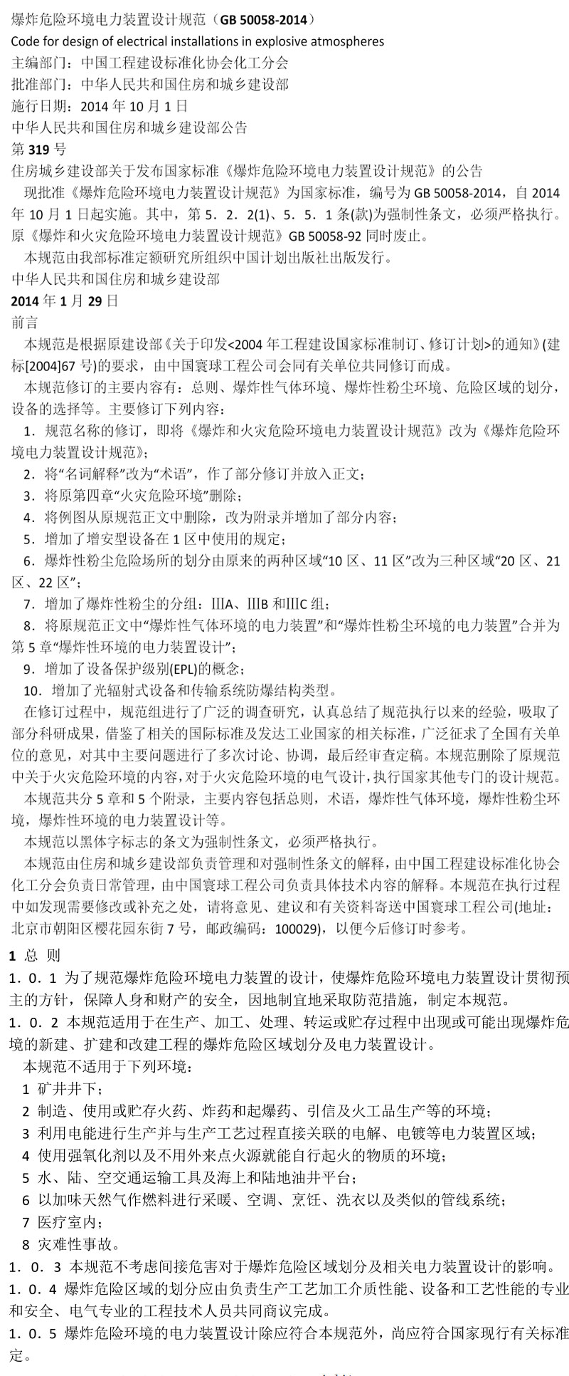 **爆炸和火灾危险环境装置电力设计规范GB50058-2014,格式为pdf,共65页。可打印下载**