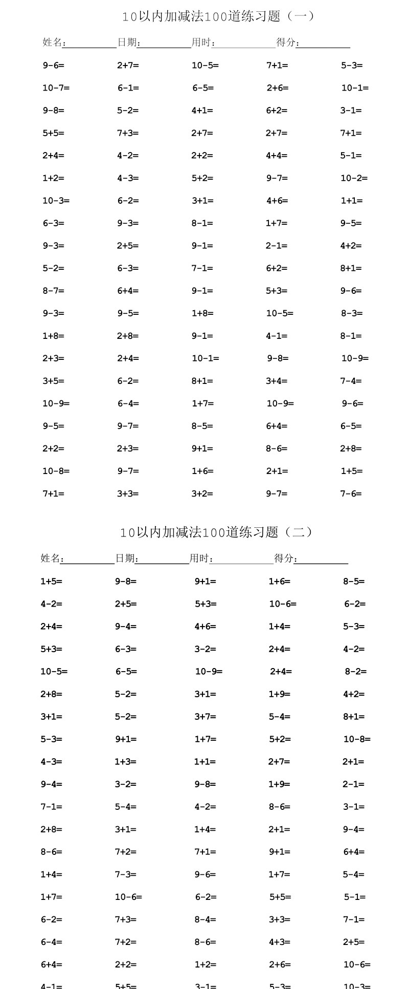 [](https://drfs.ctcontents.com/file/18725144/1243444621/45f33a/web%E5%89%8D%E7%AB%AF02/%E6%95%99%E8%82%B2%E6%A8%A1%E6%9D%BF/2024051001list.jpg) **10以内加减法100道练习题,格式为pdf,共4页,可打印下载**
