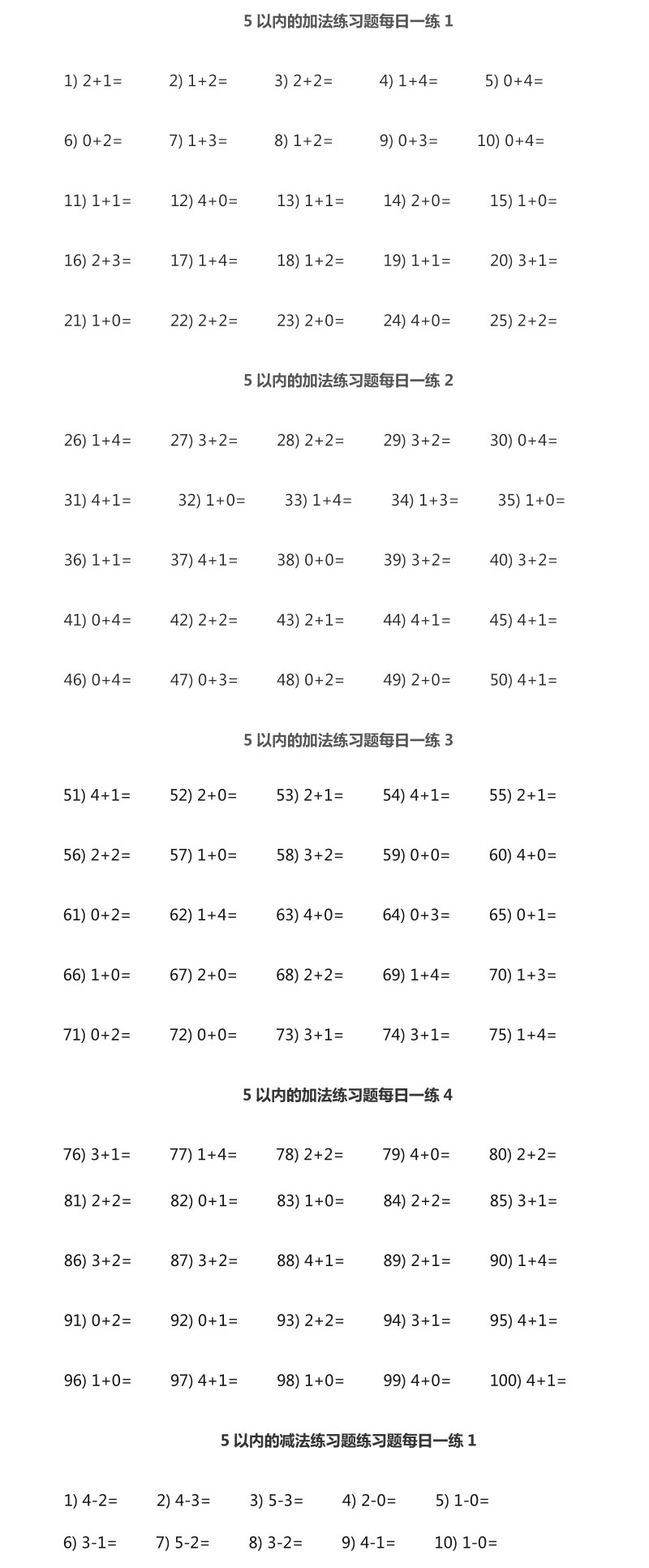 [](https://drfs.ctcontents.com/file/18725144/1244523820/4101a6/web%E5%89%8D%E7%AB%AF02/%E6%95%99%E8%82%B2%E6%A8%A1%E6%9D%BF/2024051102list.jpg) **5以内的加减法每日一练可直接打印,格式为pdf,共15页,可打印下载**