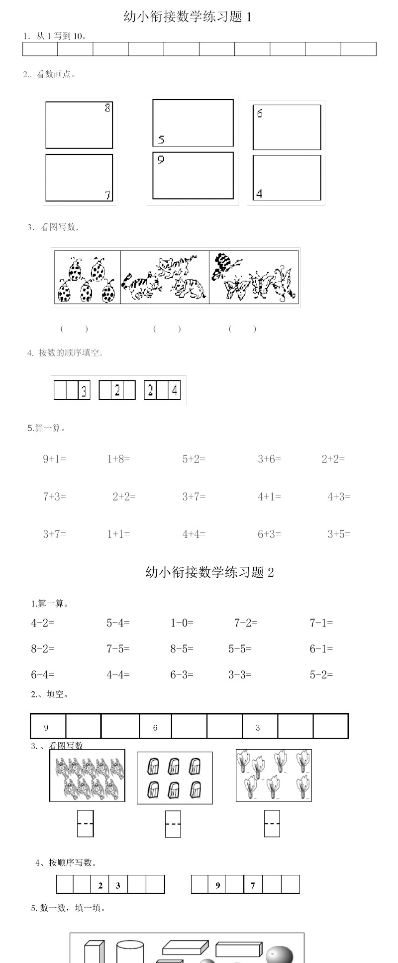 [](https://drfs.ctcontents.com/file/18725144/1244523832/c77802/web%E5%89%8D%E7%AB%AF02/%E6%95%99%E8%82%B2%E6%A8%A1%E6%9D%BF/2024051108list.jpg) **幼小衔接数学练习题共15套(A4打印版),格式为pdf,共15页,可打印下载**