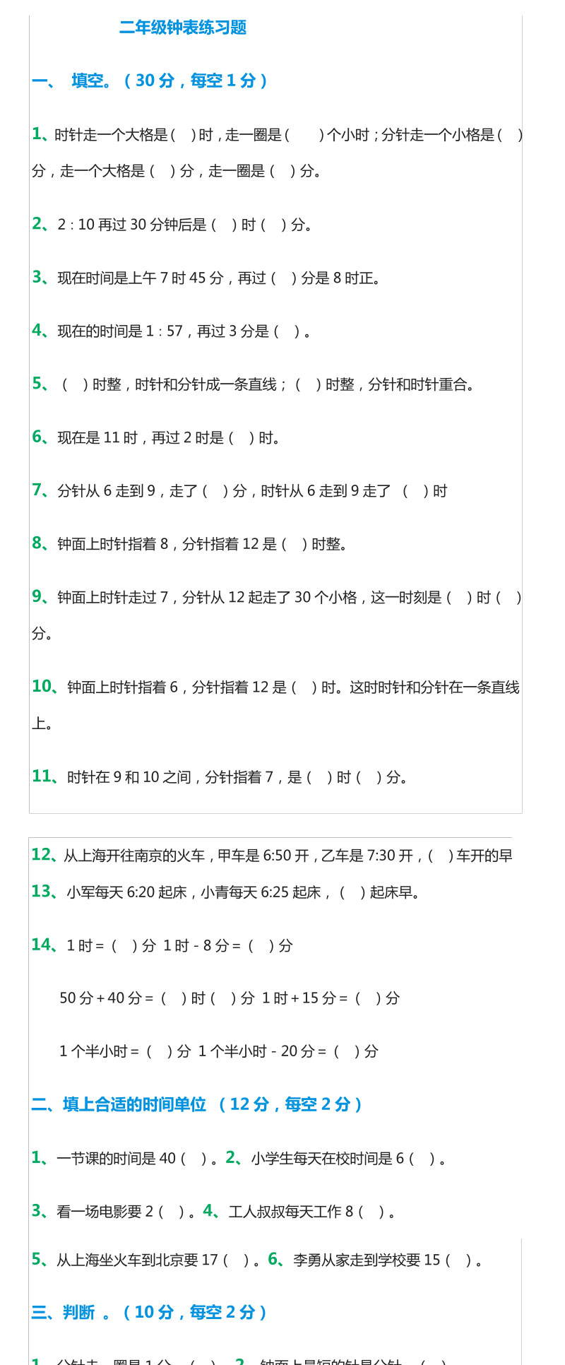 二年级 钟表练习题