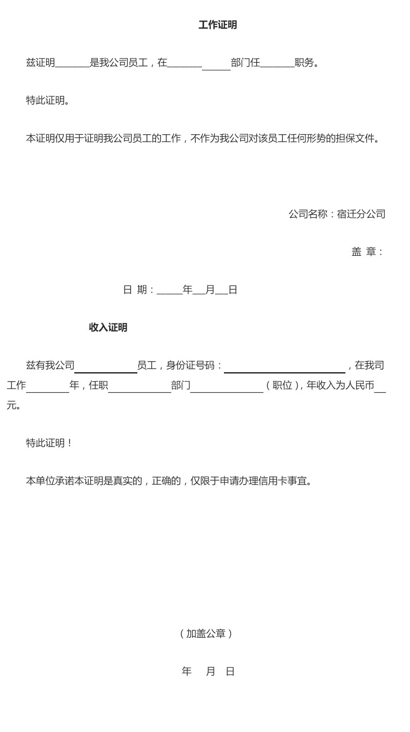 工作证明范本